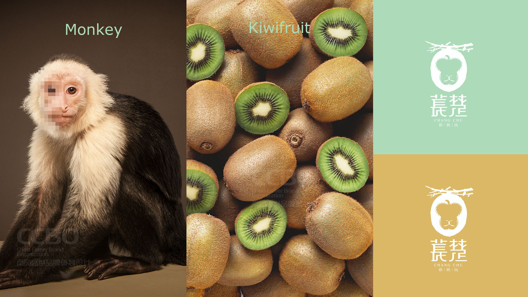 江西VI設計公司的觀念是品牌標志是品牌形象的核心,標志外形為獼猴桃,負型為猴子臉部形狀,體現了天然的特點。標志簡潔明了,達到以視覺的感知力來體現行業的特性